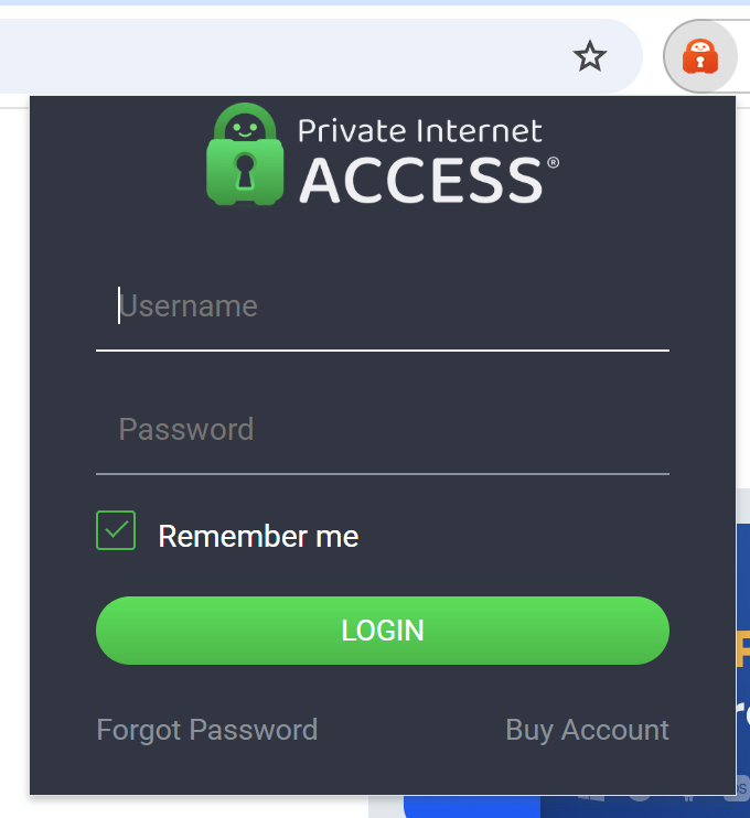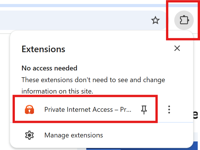 To open up the extension, click the puzzle icon at the top right of Chrome next to the address bar. Click on the “Private Internet Access” extension.